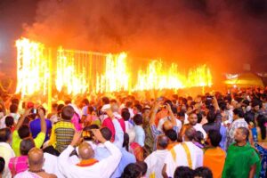 జ్వాలాతోరణ సంప్రదాయం వెనుక అనేక పురాణ గాథలు ఉన్నాయి. పాలకడలి మథనవేళ పుట్టిన హాలాహాలాన్ని లోకహితం కోసం స్వీకరించవ లసిందిగా జగన్మాత శివుడిని ప్రార్థించిన సందర్భానికి సంకేతంగా ఈ ఉత్సవం జరుపుకుంటారు. గరళాన్ని గళంలో నిలిపిన పతికి ఎలాంటి హాని కలుగ•కూడ దని, అలా క్షేమంగా బయడపడితే చిచ్చులతోరణం కింద నుంచి నడిచివస్తామని పార్వతీదేవి మొక్కు కుందట. అలా శివపార్వతులు మూడుసార్లు దాని కింద నుంచి దాటి వెళ్లారట. మరో కథనం ప్రకారం, దానవ సంహారానికి వెళ్లిన శివుడు ఎంతకూ తిరిగి రాకపోవడంతో పార్వతీదేవి పతీవియోగ విరక్తితో అగ్ని ప్రవేశానికి సిద్ధంకాగా, శివుడు ప్రత్యక్షమై ఆమె ప్రయత్నాన్ని నివారించాడు. ఆ చితిని జ్వాలా తోరణంగా మార్చి, వారిద్దరు విలాసంగా దానికి మూడుసార్లు ప్రదక్షిణ చేశారు.